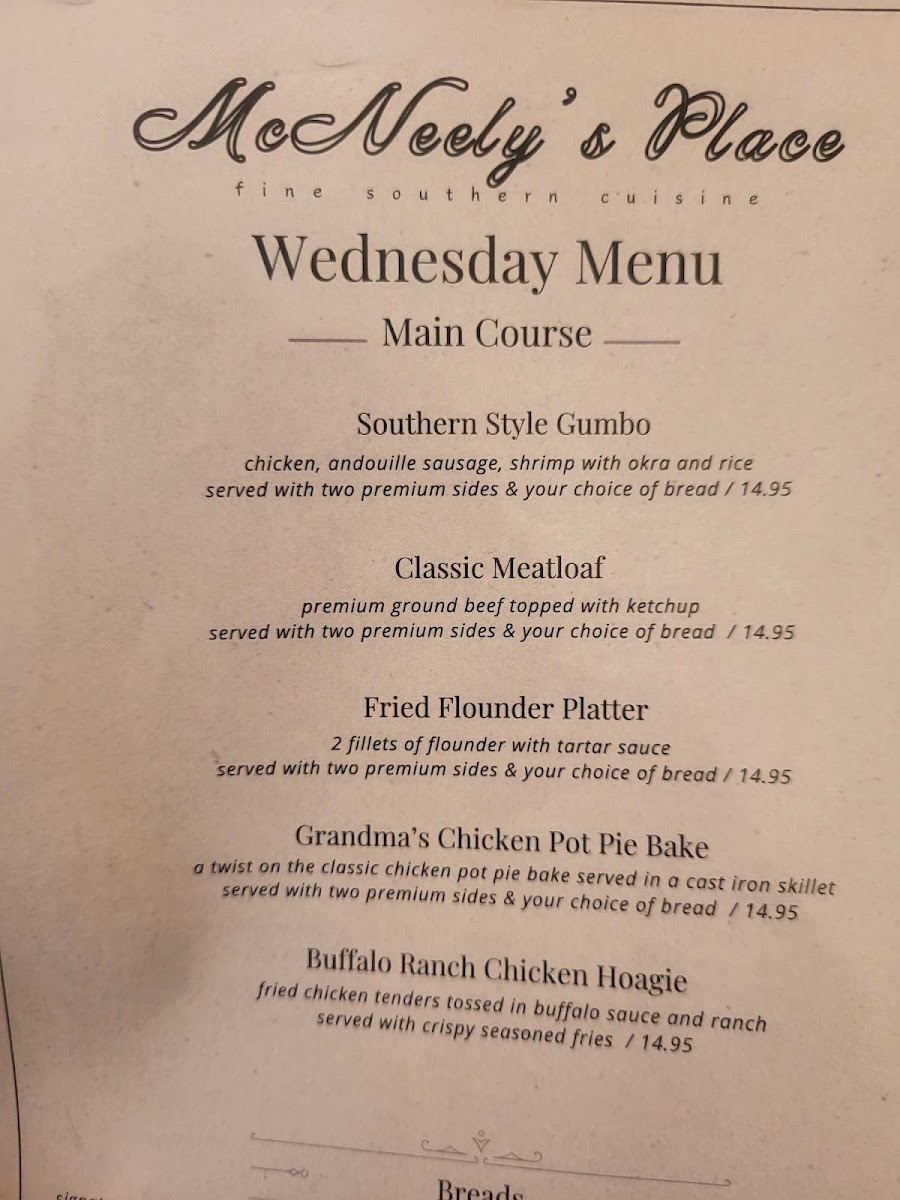 “ I recently dined at McNeely’s Place and was absolutely blown away by the experience. From the moment I walked in, the warm and welcoming atmosphere made me feel right at home. The decor is charming and cozy, perfect for enjoying a delicious meal. The food is simply outstanding! Every dish we tried was bursting with flavor and made with love. You can truly taste the difference that fresh, high-quality ingredients make. My personal favorite was the meatloaf and squash casserole, pure comfort food at its finest. What really sets this place apart is the exceptional service. The staff is incredibly friendly and attentive, making sure every guest feels like family. They went above and beyond to ensure our dining experience was perfect. If you're looking for a place that offers amazing homestyle cooking, a cozy atmosphere, and top-notch service, McNeely’s is the spot. I can't recommend it highly enough. I’ll definitely be back soon! ”